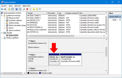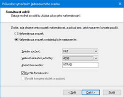 SD kartu je nutné před použitím naformátovat ve čtečce karet na formát FAT16 (jediný formát podporovaný ATpadem). Na SD kartě se může nacházet více oddílů disku (max. 4), ATpad použije první nalezený oddíl s formátem FAT16. Postup při vytvoření SD karty pod Windows: