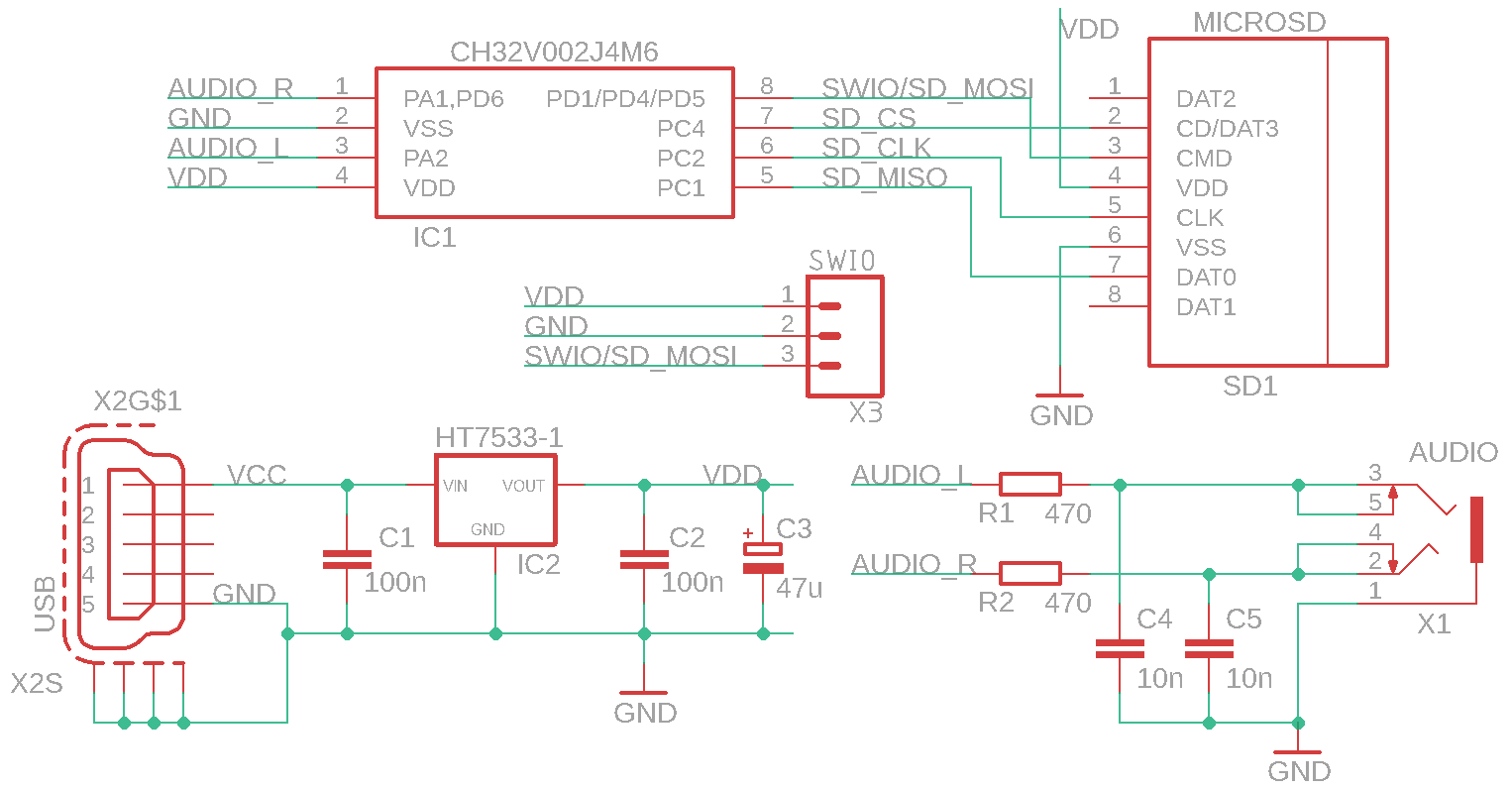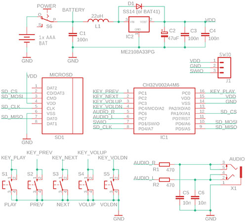 BabyBeat and BeatleBeat are stereo mini players for music files from SD card - "ImaPlayer". BabyBeat is a version with 5 buttons, a CH32V002A4M6 processor, powered by a 1.5V AAA battery and a 3.3V voltage converter. BeatleBeat is a minimalist version with a CH32V002J4M6 processor and USB power supply with a 3.3V stabilizer. The power supply for the players is only an example; everyone can certainly adjust the power supply to their liking. Please note that although the processor can be operated at 5V, the SD card requires a voltage of 3.3V. If you notice interference (humming) with some SD cards, it can be reduced by increasing the capacitor capacity in the power supply. The default volume can be adjusted by changing resistors R1 and R2.