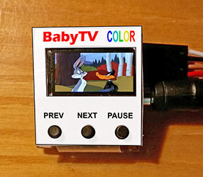 BabyTV is a miniature video player from an SD card, with a CH32V002A4M6 processor and a 160x80 pixel SPI LCD color display. The display is a 0.96" ST7735S SPI IPS LCD with a resolution of 160x80 pixels, ST7735S controller, and 3.3V voltage (https://pajenicko.cz/komponenty/displeje/barevny-displej-ips-0.96-80x160-st7735s-spi ). In addition to the display, the player only has 3 control buttons, a microSD card slot, an audio connector, 1 resistor, and 2 capacitors. The prototype does not handle power supply - the player is powered from an external 3.3V source (programmer). The power source can be, for example, a 1.5V single cell battery with a ME2108 3.3V voltage converter (https://pajenicko.cz/miniaturni-menic-napeti-step-up-me2108-0.9v-3.3v-na-3.3v-az-400ma ) or a 3.7V battery with a 3.3V linear stabilizer.