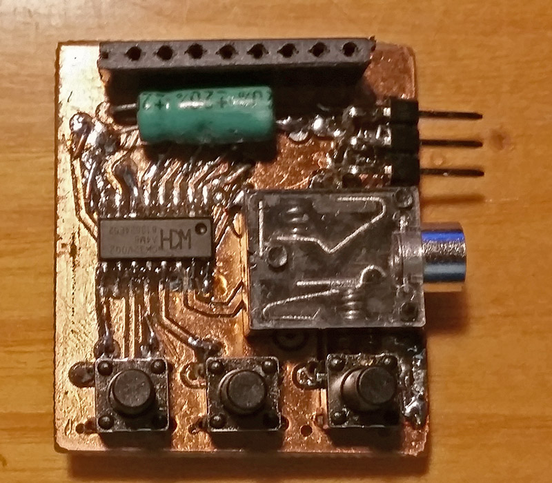 The piano is powered by a CR2032 battery. It can also be powered by an external voltage in the range of 3 to 5V. The programming connector is also used as a power switch - the device is turned on by connecting a jumper between the BAT and VCC pins. However, it is not necessary to use the power switch. If you do not need to program the processor, you can desolder the connector and simply connect the BAT and VCC pins. If the piano is not used for more than 5 seconds, the processor goes into power-saving mode, consuming only 10 uA from the battery. In power-saving mode, the battery will last for about 1 year. If you need to reprogram the processor, it may not be possible while the processor is asleep - you must wake up the processor by pressing any key or disconnecting the power supply, and then start programming the processor within 5 seconds.