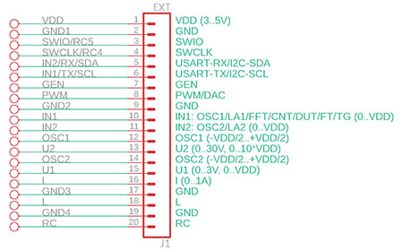3 SWIO ... Data programming input. Used to program the processor with a programmer. Internally, this signal is also used to control resistor R5 when measuring resistors and capacitors. For this reason, the processor cannot be programmed when the page for measuring resistors or capacitors is selected.