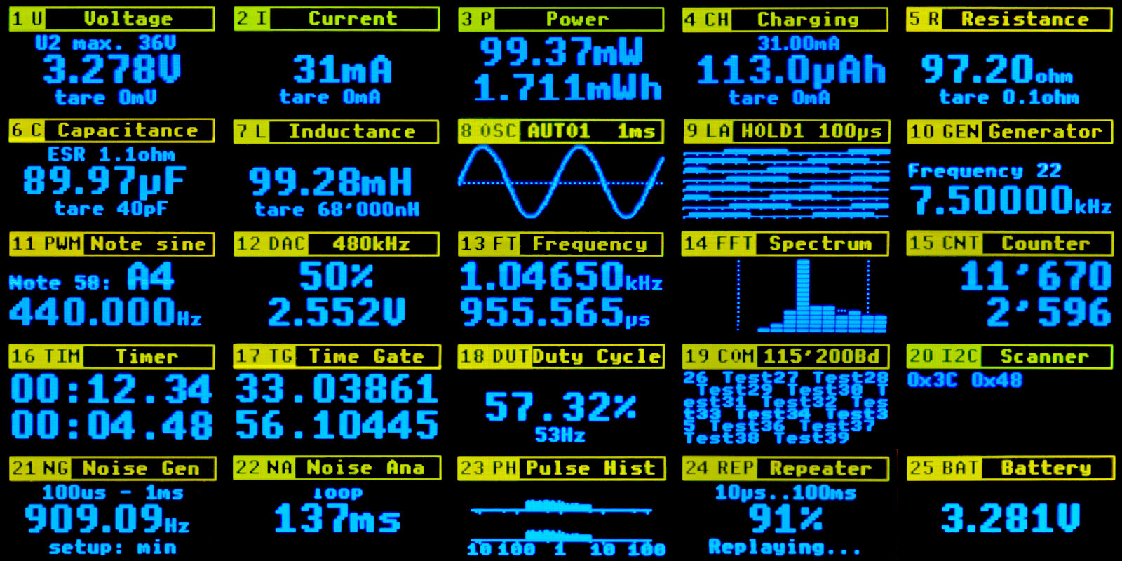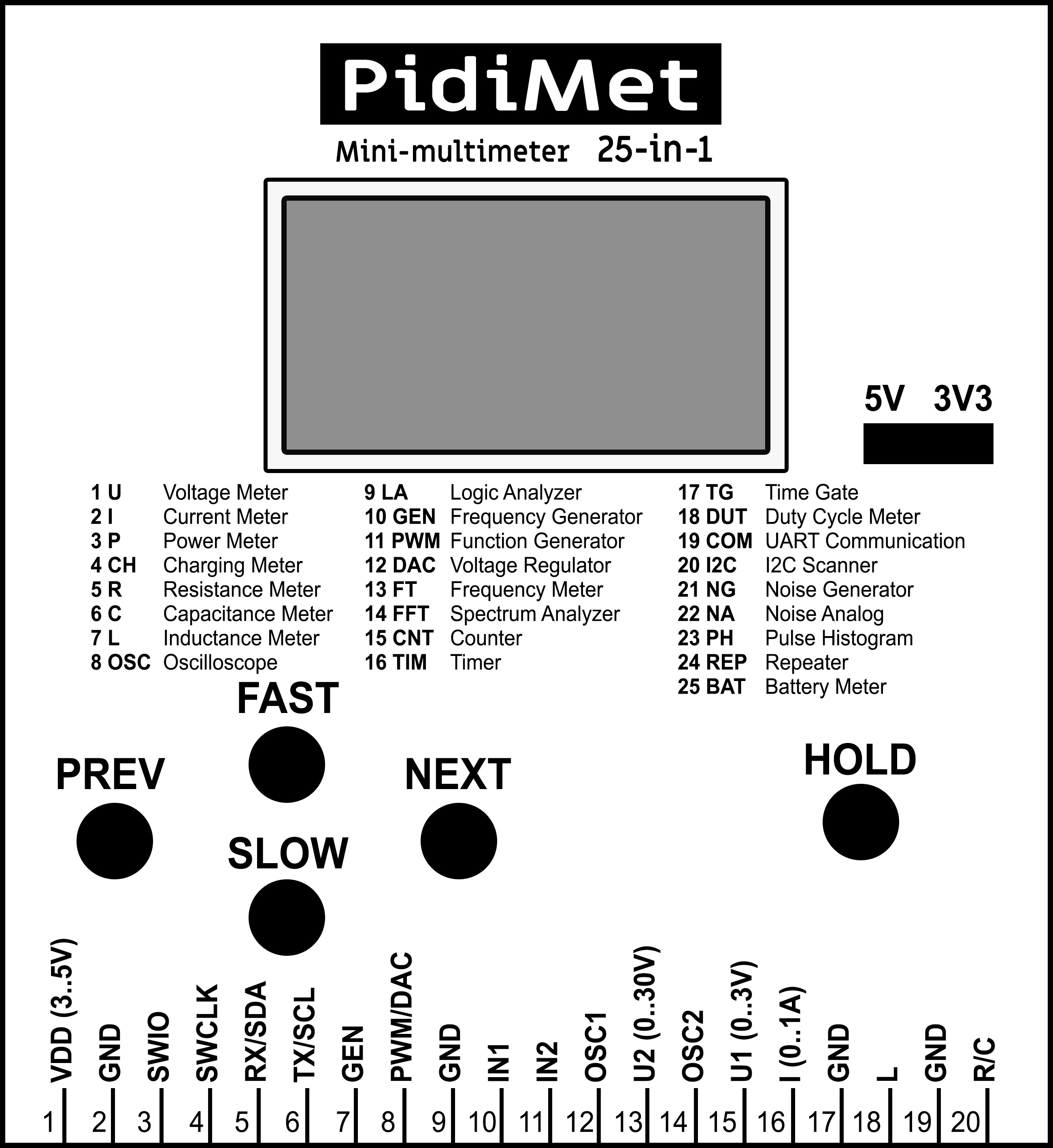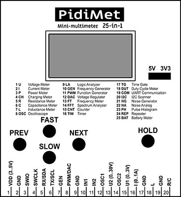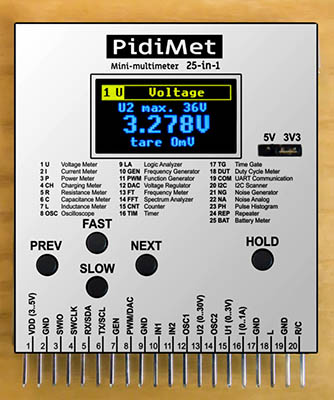 PidiMet is small, low-cost, universal multimeter with 25 functions and CH32V006 processor. It includes measure of voltage, current, power, charging, resistance, capacitance, inductance, oscilloscope, logic analyzer, frequency generator, function generator, voltage regulator, frequency meter, spectrum analyzer, counter, timer, time gate, duty cycle, UART communication, I2C scanner, noise generator, analog noise, pulse histogram, repeater, and battery meter.