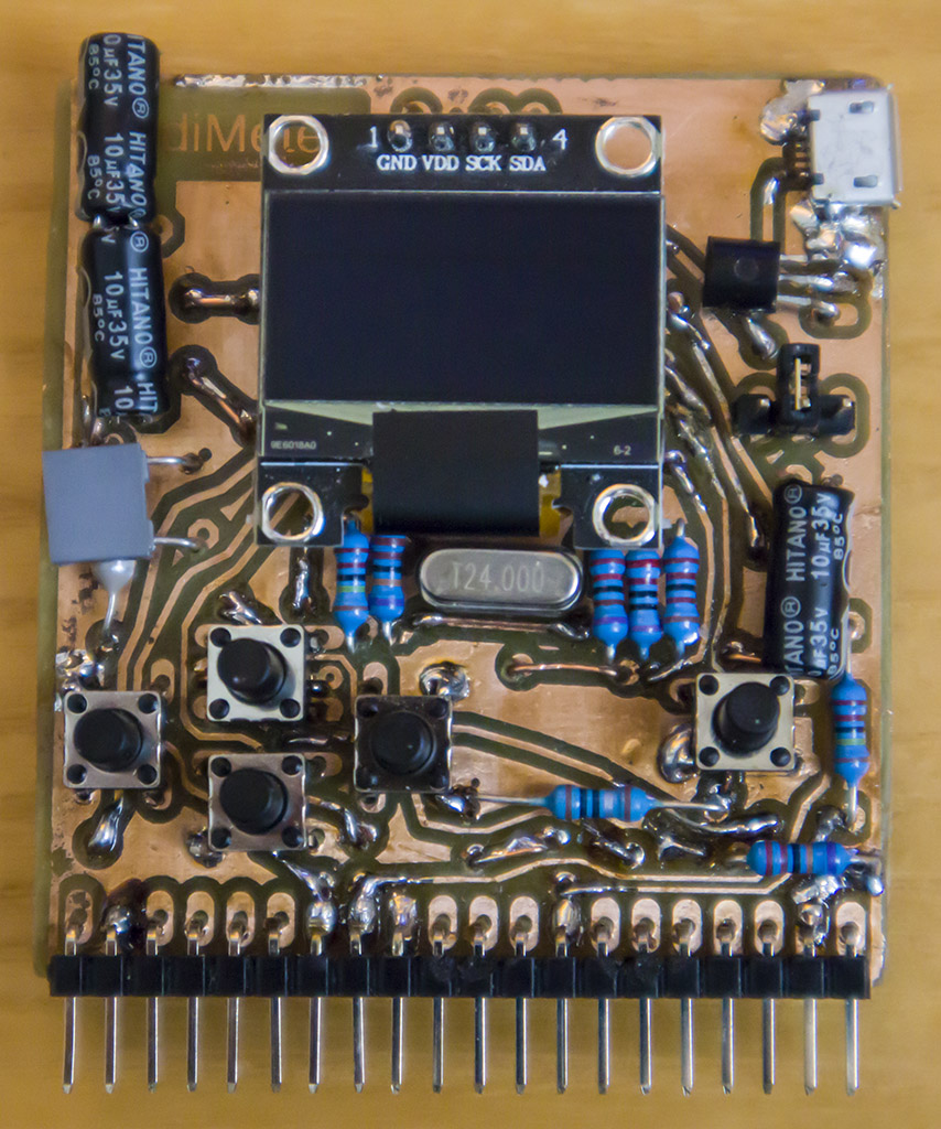 Although it is not a precise and perfect device, it can be very useful in amateur practice as a basic measuring and testing device. For analog functions, the accuracy is usually in the range of 5 to 10%, for digital functions around 50ppm, which is sufficient for normal amateur practice. The dimensions of the PidiMet are 55x60 mm.