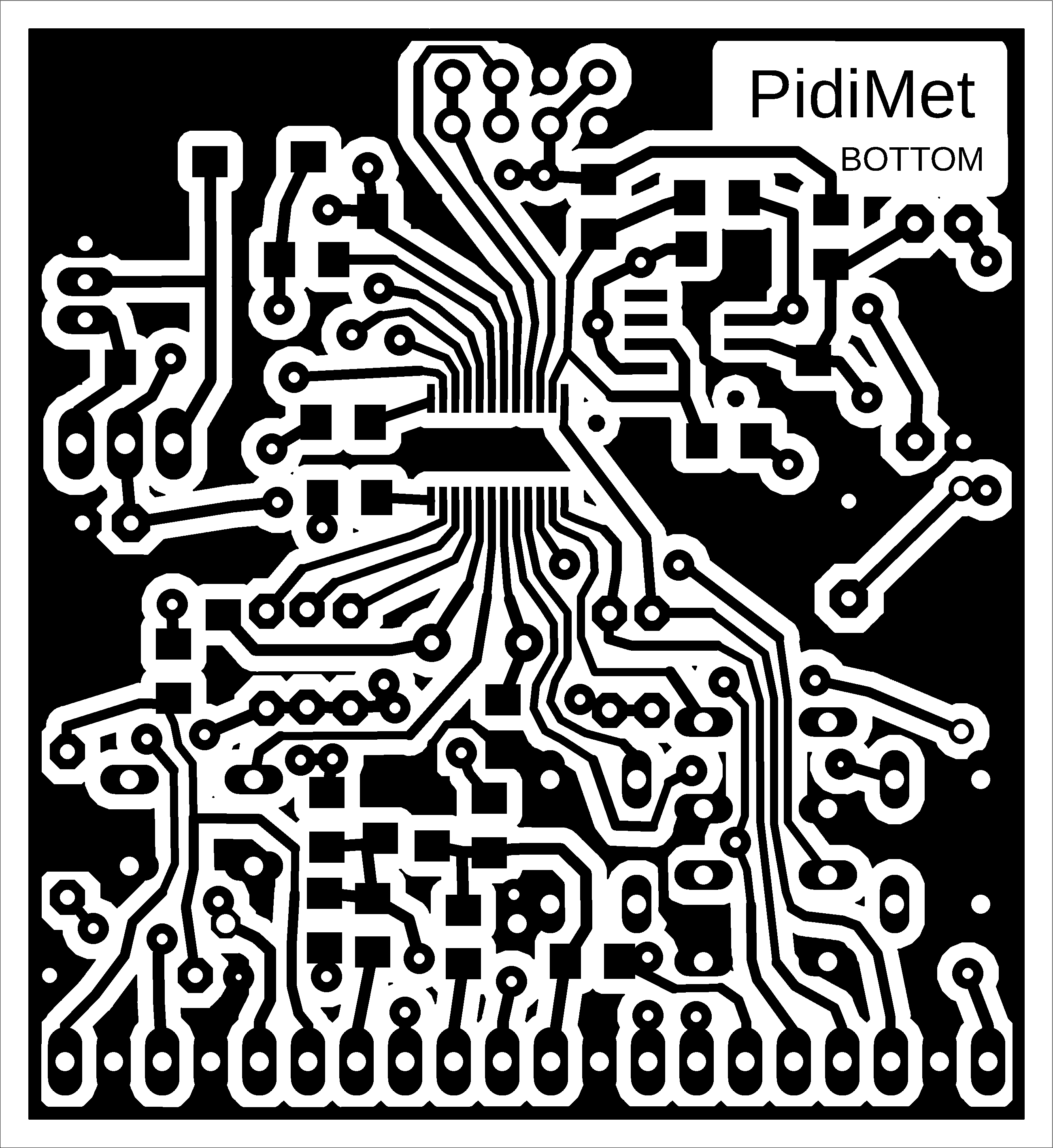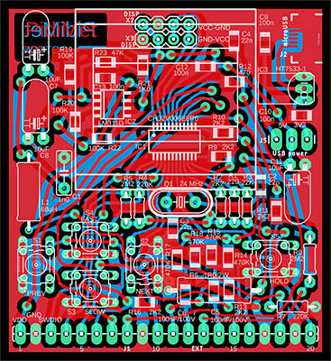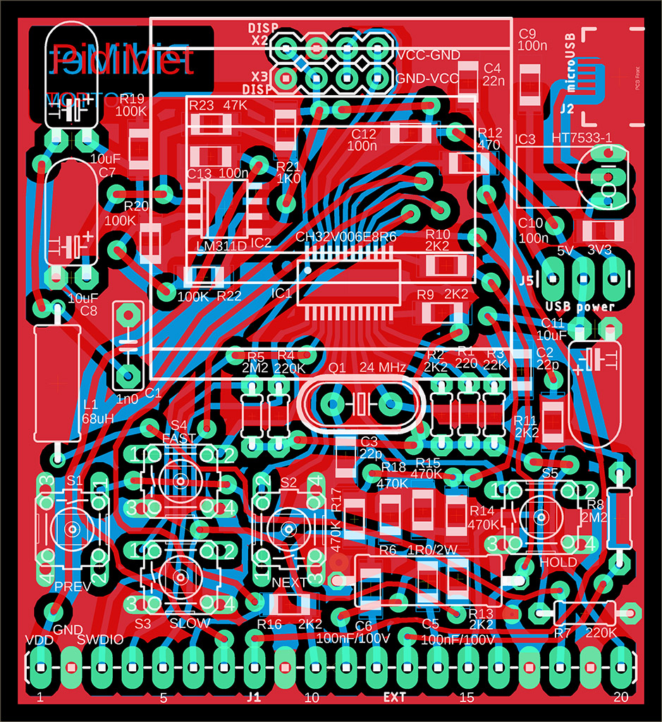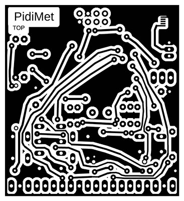 I recommend using the printed circuit board shown here only if you have no other option with a better design. The purpose of this design was to create a prototype for the possibility of programming PidiMet. However, the design is adapted to the fact that I manufacture printed circuit boards at home using a photochemical process - i.e., unnecessary through-holes and wiring are used, which would not be the case with a professional double-sided PCB. Probably due to poor design, there is also an error - sensitivity to high frequencies, such as occasional processor freezing when generating 24 and 48 MHz with a 5V power supply.