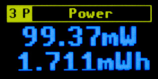 3 P Power Meter - Circuit power consumption measurement. Both inputs are used for power consumption measurement - voltage measurement (inputs "15 U1" or "13 U2") and current measurement (input "16 I"). Power consumption is measured for 500 ms - the current measured voltage and current values are multiplied together, with a time step of approximately 400 µs. This allows the actual power consumption to be measured even when the voltage and current phases are different. However, the measurement can only be used within the ranges given by the voltage and current measurements, as described in modes "1 U" and "2 I" - typically positive voltage up to 3V (U1) or 30V (U2) and current up to 1A (input I).