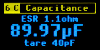 Capacitors can be measured in the range from 1 pF (assuming zero calibration) to 4 mF, with a resolution of 1 pF. The measurement accuracy is typically 10%. ESR is measured in the range from 0.1 ohms to 100 ohms. ESR measurement is only indicative and very inaccurate - it is used only for a basic assessment of the quality of the capacitor; the measured value cannot be taken as a reference value.