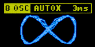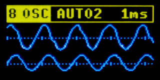 In XY mode, the first channel IN1/OSC1 controls the horizontal axis, while the second channel IN2/OSC2 controls the vertical axis. The image is stretched across the entire display area. If both input signals are in the range of 0 to VDD, a curve measuring 128x48 pixels is displayed (i.e., stretched sideways).