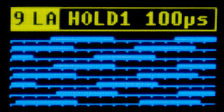 9 LA Logic Analyzer - The logic analyzer allows you to display digital signals in one or two input channels. In single-channel mode, the input signal is fed to input "10 IN1". In dual-channel mode, the second signal is fed to input "11 IN2". In single-channel mode, the signal is displayed divided into 8 lines. There are 16 marks on each line. Each mark represents one time interval. The total duration of the displayed signal corresponds to 128 marks.