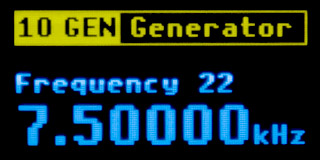 21 NG Noise Generator - The noise generator generates a digital signal with random LOW and HIGH pulse widths on the "7 GEN" output pin. The SLOW and FAST buttons can be used to select the range of generated pulse widths from 2us to 50ms. The HOLD button can be used to select whether the SLOW/FAST buttons set the upper or lower limit of the generated pulse range. If the minimum value is higher than the maximum, the program will swap the values. The first row of the display shows the currently set limits of the generated pulses. The middle row shows the corresponding center frequency as it would be detected by a frequency meter with a long measurement time. The bottom row shows the setting mode, whether the minimum (first limit) or maximum (second limit) of the generated pulses is being set. It is not possible to set both limits to 2us - the program would not be able to generate pulses fast enough.