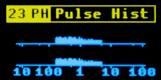 23 PH Pulse Histogram - The pulse histogram is similar to a spectrum analyzer for digital signals. The input digital signal is fed to the "10 IN1" input. Two graphs (histograms) are displayed on the screen. The upper histogram represents the number of pulses with a HIGH level. The lower histogram represents the number of pulses with a LOW level. The horizontal axis represents pulse lengths on a logarithmic scale. The axis has marks representing pulse lengths of 10us, 100us, 1ms, 10ms, and 100ms. Between the marks, there are also shorter marks representing pulse lengths of 5us, 50us, 500us, 5ms, and 50ms. The HOLD button resets the histograms.