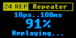The time between pressing the FAST button and the first edge of the signal is stored as the length of the first pulse, and this length is also used during playback. Again, no overflow check is performed - this means that signal playback may start with a delay of up to 100 ms after pressing the play button. During signal recording, the buffer fill counter is incremented in percent on the display. Recording ends either when the buffer is full or when any of the buttons is pressed.