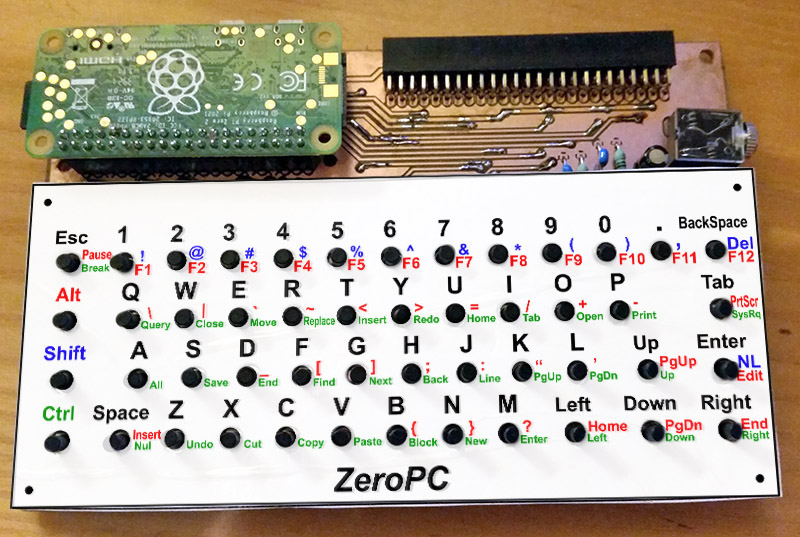 ZeroPC je malý počítač založený na modulech Raspberry Zero 1 nebo Zero 2. Běžně se předpokládá použití s modulem Zero 2 v 64-bit módu. Kromě modulu obsahuje ZeroPC stereofonní zvukový PWM výstup, výstup na HDMI displej, externí konektor pro připojení periferií a interní klávesnici z 49 mikrospínačů. K dispozici je boot loader umožňující snadné spouštění programů z SD karty.