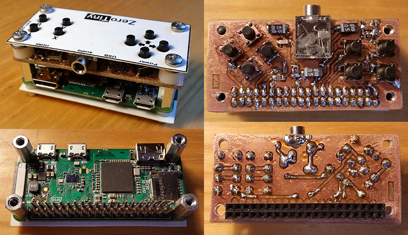 ZeroTiny je nejjednodušší herní konzole s moduly Raspberry Zero 1 nebo Zero 2. Přednostně se doporučuje používat modul Zero 2 v 64bitovém módu. Modul Zero 1 může být v některých aplikacích znatelně pomalejší. ZeroTiny obsahuje 8 tlačítek, stereofonni zvukový PWM výstup a výstup na HDMI displej. K dispozici je boot loader umožňující snadné spouštění programů z SD karty.