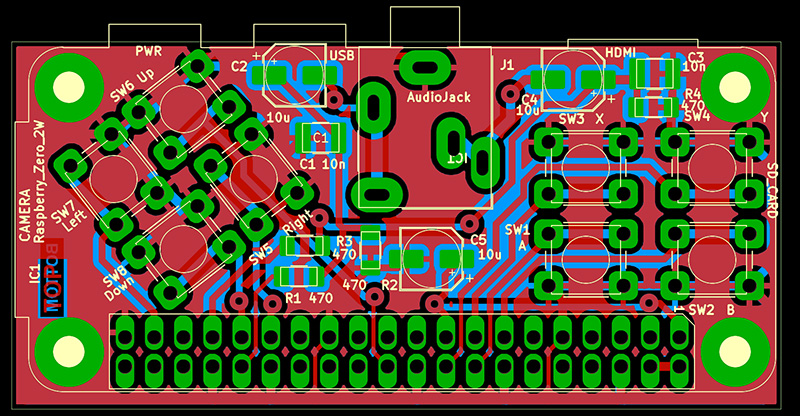Modul Zero doporučuji nepřiletovat napevno do základní desky, ale použít 8mm dutinkovou lištu - umožní to snadnou výměnu modulu pokud ho budete chtít použít v jiném zařízení nebo pokud budete chtít použít jiný modul, např. namísto Zero 2 použít Zero 1. Na desce jsou 3 elektrolytické kondenzátory - pozor na jejich umístění aby nepřekážely horní desce, možná bude nutné je umístit naležato. Přiletujete-li modul Zero do desky přes pinovou lištu, bez zásuvné dutinkové lišty, může být možné použít pouze jeden krycí panel, přes celý rozměr desky. Při použití dutinkové lišty je nutné použít dva panely - panel nad modulem bude výše a bude přišroubován k panelu klávesnice přes sloupky. Piny na externím konektoru jsou rozděleny do skupin, aby bylo možné připojovat malé moduly jen pro určitý interface. Slepé piny jsou ucpány např. bužírkou, aby nemohlo dojít k nesprávnému zasunutí konektoru - konektor by v tom místě neměl mít kolík. Mezi jednotlivými skupinami je mezera 1 pin - buď v tom místě konektor přerušte, nebo vyznačte na desce výrazněji, kde se která skupina pinů nachází.