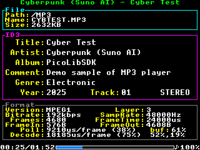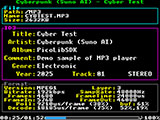 Doporučuji používat MP3 soubory s konstantní bitrate. Některé starší formáty MP3, nebo MP3 s variable bitrate, nemusí umožňovat posouvání ukazatele přehrávání, případně skladba může skončit předčasně před koncem. Přehrávač podporuje pouze krátká jména souborů - tj. jméno MP3 souboru může mít max 8 znaků. Bude-li složka obsahovat i JPG obrázek stejného jména jako MP3, o rozměru 320x240 pixelů, zobrazí se namísto info stránky. Obrázek nebo info lze přepínat klávesou Tab. Klávesa Space přehraje aktuální adresář od první skladby. Klávesa Enter začne přehrávání od aktuální skladby.