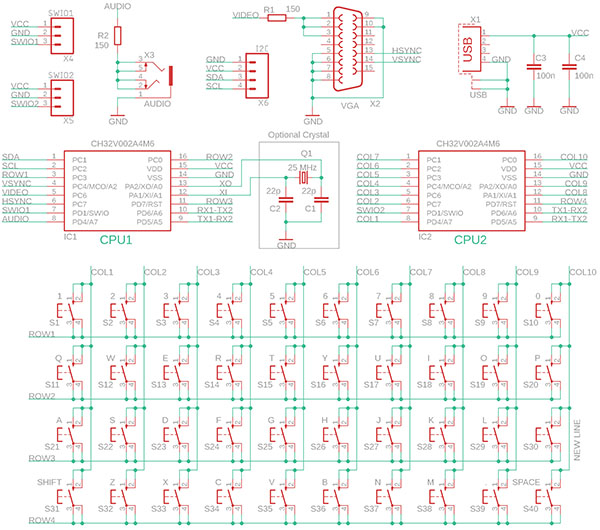 mini-počítač se 2 procesory CH32V002, vytvořený po vzoru