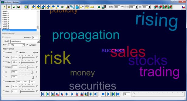 U některých vybraných slov jsem použil trochu jinou animaci - to aby se animace trochu oživila. Např. slovo "success" jsem zoomoval, zmenšil z malé velikosti na velký text a současně do ztracena (s Alfa měnící se na 0). Některé slovo jsem rozhoupal (změnou rotace), jiné rotoval. U některých jsem použil průhlednost "14 Sečíst Alfa".