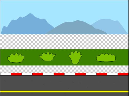 Sestavování scény jsem začal pozadím. Načetl jsem a umístil obrázek hor s oblohou. Pod ni jsem přidal pás se stromy, dále pás s keři, pás s květinami a nakonec pás přistávací dráhy. Pásy se budou pohybovat tak, že se budou posouvat do strany a budou se horizontálně opakovat, jako dlouhý pás stejných obrázků. Proto je nutné zajistit seamless pásů už při kresbě, tedy aby začátek a konec pásu na sebe mohly navazovat (aby na okraji nebyla např. jen půlka stromu).