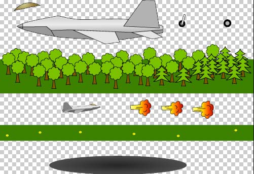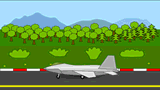 Vzorem stíhačky byl americký F-22 Raptor. Grafiku jsem nakreslil v Illustrátoru. V této animaci nebude statické pozadí. Sledování kamery je simulováno tak, že kolem stíhačky ubíhá pozadí. Pro vytvoření dojmu prostorovosti je pozadí rozděleno do pásů, které se pohybují různou rychlostí. Pod stíhačkou ubíhá přistávací dráha, ta se pohybuje maximální rychlostí. Aby bylo znát, že se dráha pohybuje, je povrch dráhy narušen několika prasklinami a okraj dráhy tvoří přerušovaná čára. Za dráhou ubíhá pomalejší rychlostí pás trávy s květinami. Za květinami je pás s keři, opět s ještě nižší rychlostí. Za keřy je pás stromů (v dálce), ty mají nejnižší rychlost. No a nakonec je v dálce pás s oblohou a horami, ty se nepohybují vůbec. Pozadí je tedy rozděleno celkem na 5 pásů.