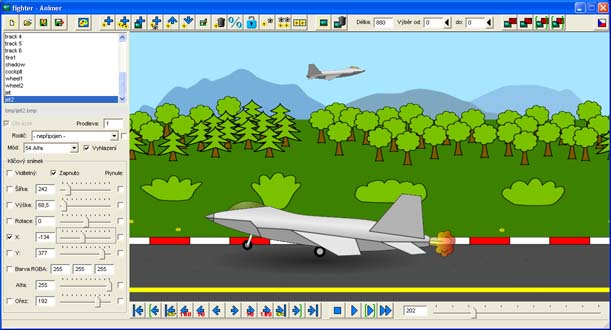 Ke stíhačce připojím kolečka a obrázky plamenů. Plameny načítám jako animovanou sekvenci s prodlevou 4. Když přehraji animaci, plameny by měly vzadu ze stíhačky plápolat. Plameny trochu zprůhledním nastavením Alfa na asi 160, přitom musím stáhnout Ořez na asi 60. Ke stíhačce připojím ještě kokpit a trochu ho zprůhledním nastavením Alfa na 140.