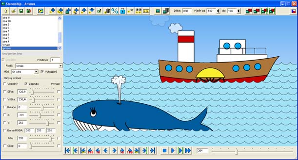 Parník jsem rozpohyboval podobně jako vlak v minulé animaci - na snímku 0 jsem nastavil pozici velmi vlevo, na snímku 440 (animace měla délku 880) na pozici velmi vpravo a současně jsem pro druhou půlku animace změnil šířku z +50% na .-50%, čímž se parník otočil (opět jsem chtěl, aby parník plul tam a zpátky).