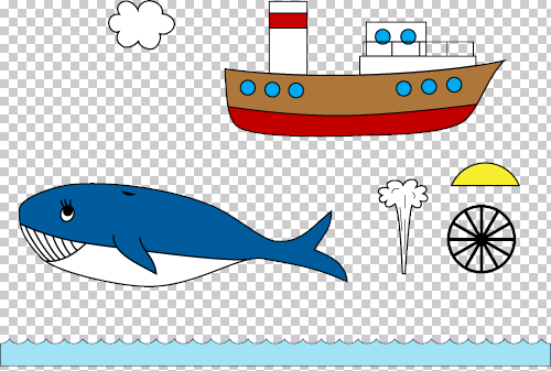 Přidal jsem velrybu a parník a umístil je na optimální pozice - to abych měl porovnání optimálních míst. Posouváním velryby a parníku skrze seznam vlnek jsem docílil správného překrytí vlnkami (aby byly některé před a jiné za objektem).