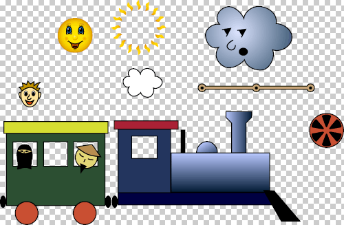 Přidal jsem 3 kolečka. Kolečka jsem připojil k vlaku (vlak je rodičem pro kolečka) a nastavil souřadnici Y tak, aby kolečka dosedla na koleje. Je-li vlak rodičem koleček, kolečka jsou k vlaku "přilepena" a pohybují se současně s vlakem. Nastavením souřadnice X jsem kolečka rozmístil podél lokomotivy. Rozteč koleček musí odpovídat rozteči děr v ojnici.