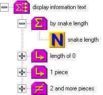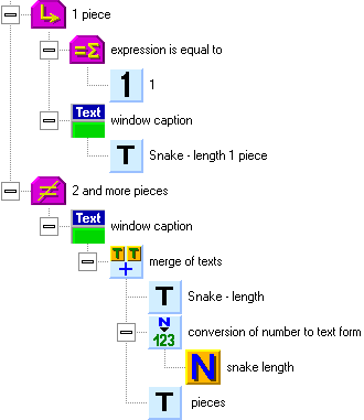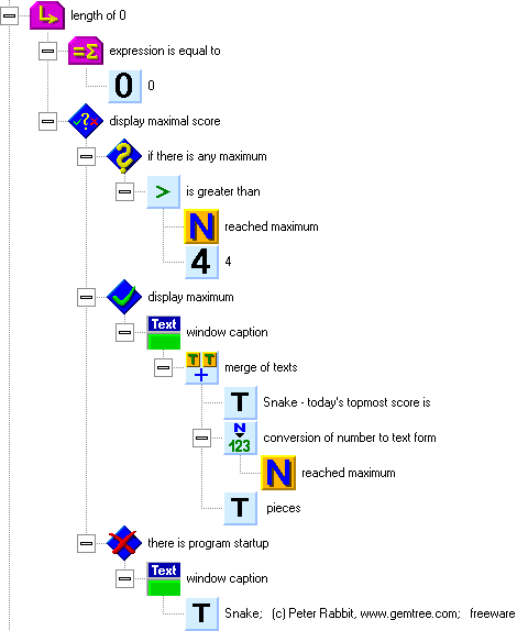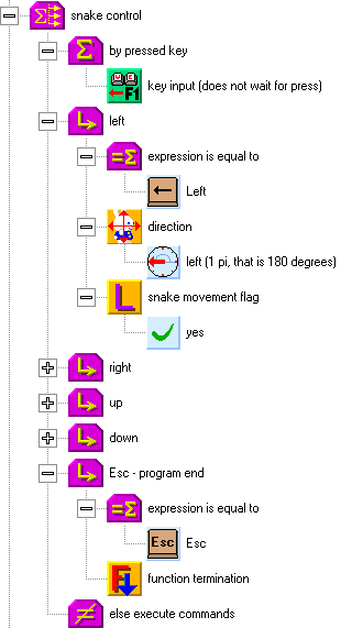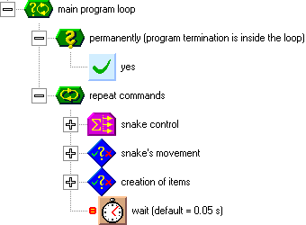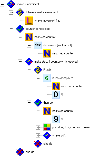 The structure for snake movement is on the following picture. Put it behind the structure of snake control, but before the generation of new items. In the beginning of the structure, you can see a test, which checks if the snake is moving (this is because in the beginning of the game, the snake stays in one place until the first direction key is pressed). When the snake moves, the counter for the next step decrements (decreases by one). When the counter reaches zero, the snake can move one step. First, we will set the next step counter again. We have chosen the number 9, which represents 2 steps per second (the basic time unit of the computer is 55 milliseconds, which equals to 18 units per second).