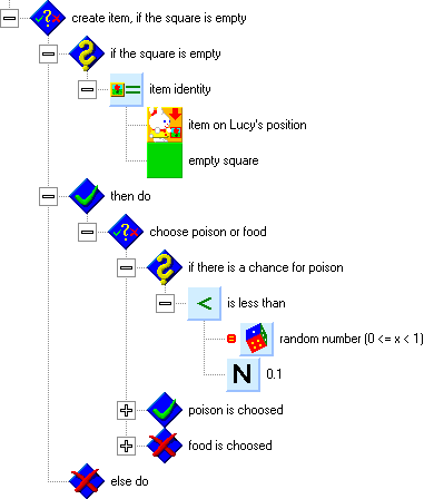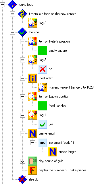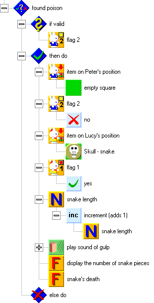 The structure for poison is similar, as you see on the following picture. Poison is indicated by Flag 2. If we find it on, we will clear the square and turn this flag off. We will perform similar steps to the structure for food. We will always use the same new piece, without respect to the type of poison. We will also turn on flag 1 on Lucys position, increase the snake length, play a gulping sound, and display the new length. Only this time, this will be finished by the death of the snake.