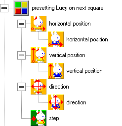 Let us return to the beginning of the structure for moving the snake one step forward. We have left Lucy on the next square, where she tested the state of flag 1. Now we will turn her back and move her one step, which will get her to the same position as the snakehead. We can add a sound for the snakes step.