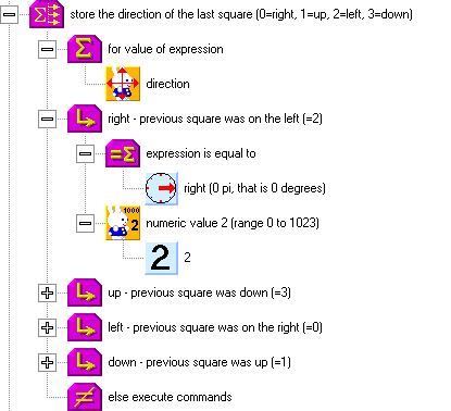 In the snake movement, we will begin with Peter the snakehead. In approximately the middle of the structure of the movement, you see Peter making a step forward. The following branching structure stores a number, representing the direction of the last square, on the new square. Later, this number will help us find the way to the end of the snake.