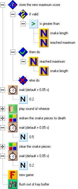 First, the length of the snake is stored as the new maximum score. After a short pause, there is a wheezy sound. The death will be indicated by redrawing all of the snake pieces to pieces with a skull. After the redrawing and a short pause, we will clear the pieces of the snake (this will indicate the process of dying). There is a short pause again, and then a new game starts.