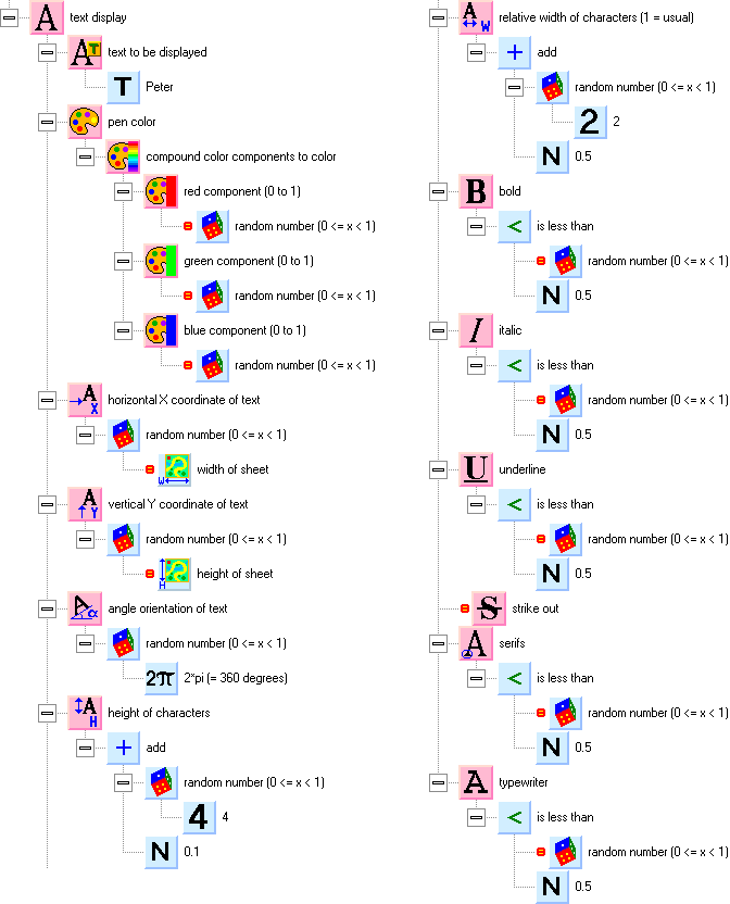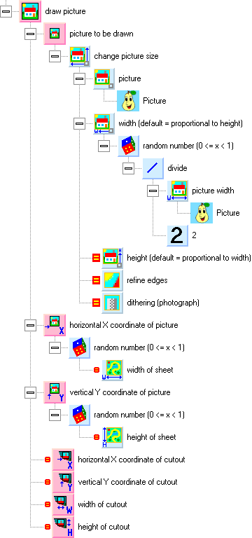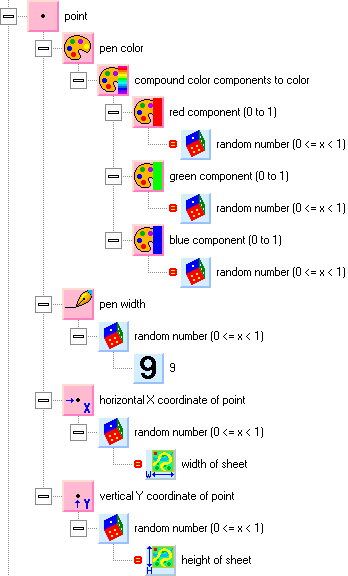 In our test program, we will try to render a picture randomly. Before you start drawing, you can look at the Library of Variables and Functions. With Peter, you also get many pictures. Open the [examples]\Drawing group. You will surely find a picture that you will like. When browsing, click to select the first picture in the group, and then scroll the selection cursor up and down by using the arrow keys. The editing window will show previews of the pictures.