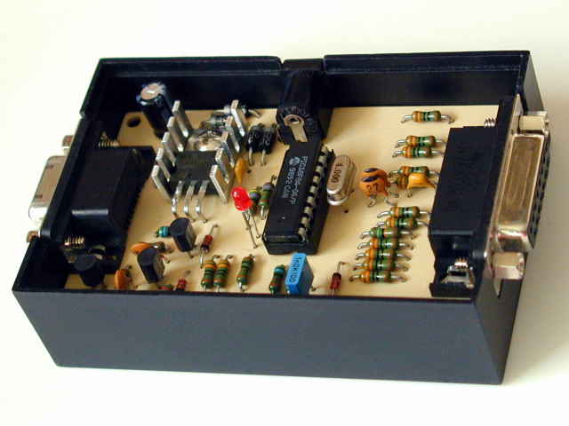 Osazování začněte konektory. Nejchoulostivější součástkou je napájecí konektor. Jeho vývody jsou poniklované a je proto nutno k pájení použít přípravek k pájení niklu nebo kontakty před pájením obrousit a pocínovat. Pozor - konektor je z lehce tavitelné umělé hmoty a je proto nutno pájet krátce. Jako další osaďte konektory CANNON. Důkladně je zamáčkněte do spoje a přiletujte nejdříve zemnící vodiče a až potom všechny ostatní piny. Dále připevněte stabilizátor s chladičem, před montáží pocínujte plošný spoj v okolí díry pro šroubek jako dosedací místo podložky pod matkou. Nyní můžete osazovat ostatní součástky. Pozor na správnou polaritu elektrolytického kondenzátoru (kladný pól má delší vodič a jeho záporný pól je na pouzdru označen proužkem) a diod (katoda je označena proužkem na pouzdru). Při montáži tranzistorů použijte orientaci podle obrázku. LED diodu ponechejte asi 10 mm nad povrchem spoje. Anoda LED diody (kladný pól) je označena delším vývodem. Pro procesor osaďte pouze patici, samotný procesor vložte do patice až po kompletním osazení celé jednotky. Pozor na správnou orientaci patice i procesoru (značka je na straně vývodů 1 a 18). U součástek, u kterých nezáleží na orientaci, dodržujte orientaci tak, aby jejich popisy byly čitelné při pohledu zdola nebo zleva. Odpory při osazování kontrolujte ohmetrem. Barevné proužky nemusí být dobře rozpoznatelné a mohlo by tak dojít snadno k záměně odporů. Nebezpečí záměny hrozí především u odporů 5k6 a 56k. Krystalu ponechejte delší vývody a pájejte jej krátce, při přehřátí by mohlo dojít k jeho poškození.