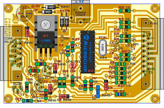 Signál DTR z konektoru COMx aktivuje mód programování procesoru. Spolu se signálem RTS určují 3 stavy procesoru: RESET (oba signály jsou vypnuty), běžný provoz (DTR je vypnut, RTS zapnut) a programování (DTR i RTS jsou zapnuty). Odpor R3 zajišťuje běžný provoz procesoru v případě, že modul je odpojen od počítače. Signálem TxD jsou během programování zapisována data do procesoru. Od signálu jsou přes kondenzátor C7 odvozovány hodinové impulsy. Tranzistory T2 a T3 zajišťují převod výstupního signálu z procesoru na úrovně RS-232. Při normálním provozu je možné pomocí signálů TxD, RxD a RB7 komunikovat mezi procesorem a počítačem v poloduplexním režimu. Upozornění: Modul nelze používat s COM porty, jejichž výstupní napětí je menší než 11.5 V (některé notebooky používají 9V nebo i méně).