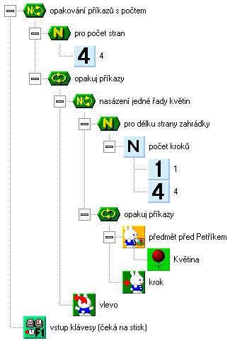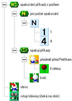 Všimněte si, jak lze program díky popisům prvků číst celkem přirozeným způsobem: "Pro počet opakování 14 opakuj příkazy: polož jako předmět před Petříkem Květinu, potom udělej krok."