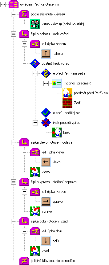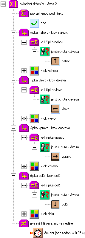 Zkopírujte si znovu variantu ovládání Petříka směry a přejmenujte ji na ovládání držením kláves 2. Podmínková konstrukce pracovala tak, že se