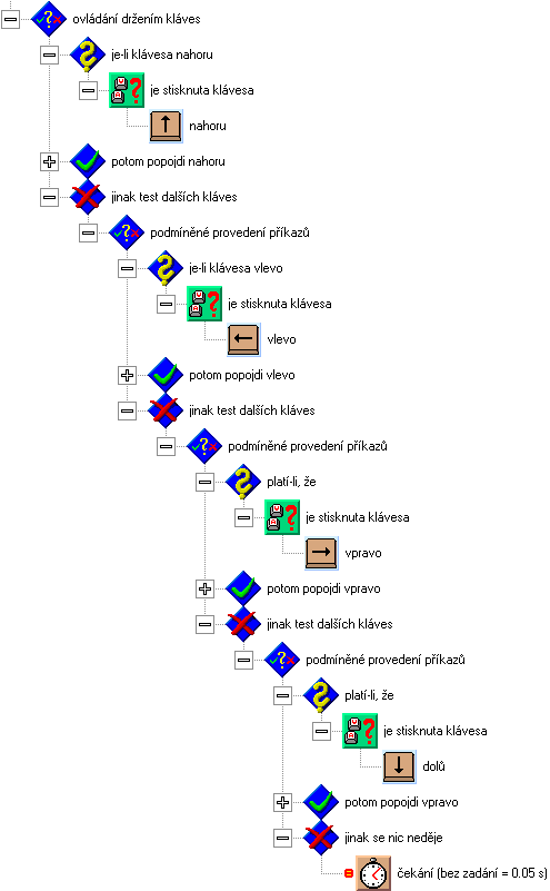 Hotovou konstrukci vidíte na dalším obrázku. Jak funguje? Program při svém chodu na začátku zjistí, že ve větvích bude testována logická hodnota platnosti. Prochází jednotlivé větve a hledá stejnou hodnotu, tedy platnou podmínku. Příkazy v nalezené větvi provede a pokračuje až za celou konstrukcí vícestupňového větvení příkazů, dalších případných splněných podmínek a větví si již nevšímá. Jinak řečeno, vykoná se první (a jediná) větev se splněnou podmínkou (stisknutou klávesou), jinak se vykoná až poslední z příkazů - čekání.