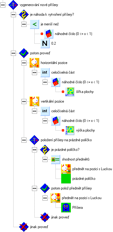 Co taková funkce s náhodou bude dělat? Z textů k prvkům čteme: "Platí-li, že náhodné číslo je menší než 0.2, vytvoř příšeru." Náhodné číslo je desetinné číslo s náhodnou hodnotou od nuly do jedničky. Číslo 0.2 je jedna pětina z jedničky. Náhodné číslo má hodnotu menší než 0.2 v pětině případů. To znamená, že při opakovaném průchodu se příšera vytvoří v každém pátém případě.