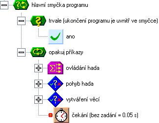 Naším dalším úkolem bude hada rozpohybovat. Rychlost pohybu hada zvolíme asi 2 kroky za sekundu. Abychom mohli lépe obsluhovat klávesnici a generování věcí, cykluje hlavní smyčka programu trochu rychleji (18 průchodů za sekundu). Proto použijeme čítač pro další krok, který zajistí posun hada při každém devátém průchodu cyklem.