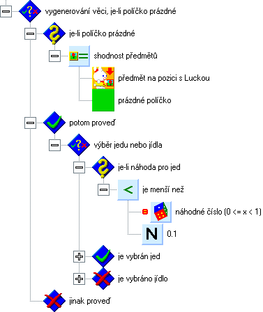 V první větvi vytvoříme lebku pro 2 případy z 6 (hodnoty 0 a 1), pravděpodobnost vzniku lebky bude tedy 33%. Ve druhé větvi vytvoříme krabičku s jedem s menší pravděpodobností - pro 1 případ z 6 (hodnota 2), pravděpodobnost vzniku je 17%. V ostatních případech vytvoříme muchomůrku - pro zbylé 3 případy z 6 (hodnoty 3, 4 a 5), pravděpodobnost 50%.