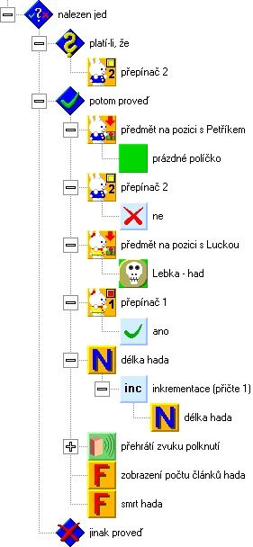Obsluha nalezení jedu je podobná. Vidíte ji na obrázku níže. Jak víte, jed označujeme přepínačem 2. Zjistíme-li tedy testem přepínače 2 nalezení jedu, opět nejdříve vymažeme políčko položením prázdného předmětu a vypneme přepínač 2. Provedeme obsluhu podobně jako při běžném jídle. Nový článek hada použijeme vždy stejný, nezávislý na nalezeném jedu. Opět zapneme na pozici Lucky přepínač 1 jako indikátor článku hada, zvýšíme délku hada, přehrajeme zvuk polknutí a zobrazíme novou délku. Vše zakončíme smrtí hada.