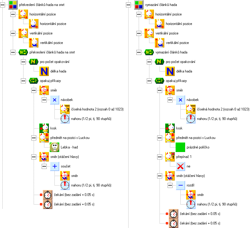 Následující obrázky ukazují obsluhu překreslení článků hada na smrt a vymazání článků hada. Opět využíváme uschované směry na předchozí políčko v číselné hodnotě 2 políčka. Provádíme přitom animaci otáčení hlavy hada (hadovi se motá hlava), v prvním případě proti směru hodinových ručiček, v druhém případě obráceně.