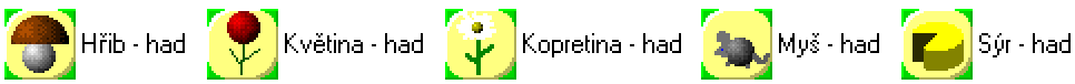 Připravíme jídlo, které bude had požírat. Vytvořte pět nových předmětů a nakreslete do nich obrázky hadího jídla. Například: