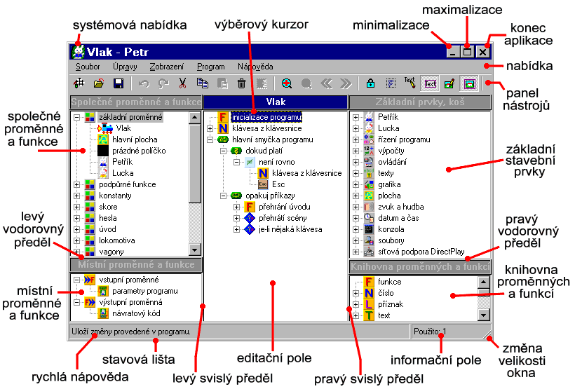 Jak si můžete všimnout, okno editoru je rozděleno na 5 polí. Vlevo nahoře je pole Společné proměnné a funkce. V tomto poli jsou prvky (funkce a proměnné) přístupné v celém programu, říká se jim proto též Globální. Pod ním je pole Místní proměnné a funkce, ve kterém jsou prvky přístupné pouze uvnitř funkce. Jiný název těchto prvků je Lokální. Tohoto pole si zatím nevšímejte. Vpravo nahoře vidíte pole Základní prvky, koš. Zde najdete všechny konstrukční prvky které máte k dispozici. Prvky jsou organizované do skupin, můžete je rozbalovat kliknutím na křížek před ikonkou. V tomto poli nemůžete nic měnit a proto má jednu zvláštní vedlejší funkci - odpadkový koš. Přenesením nějakého prvku sem do tohoto pole příslušný prvek zahodíte. Dále, o trochu níže, je pole Knihovna proměnných a funkcí. Zde si můžete vytvářet banku např. vlastních obrázků nebo odtud vkládat do programu knihovní prvky ze souborů. No a nakonec nám zbývá největší, prostřední pole. To je hlavní editační pole programu. Zde upravujeme jak programovou strukturu tak obsah grafických i jiných prvků. Čili zde tvoříme.