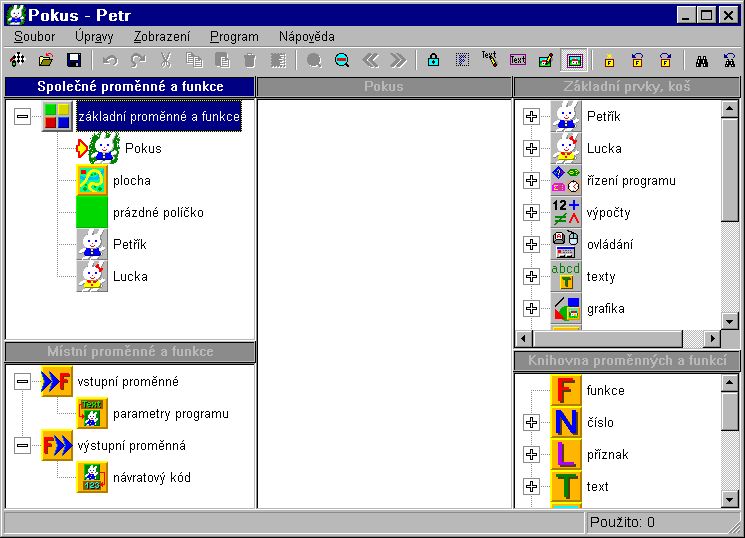 V poli Společné proměnné a funkce vidíte připravených několik prvků. Jsou všechny ve skupince základní proměnné a funkce a s žádným z nich nemůžete hýbat. První prvek, s názvem Pokus, je hlavní funkce programu. V hlavní funkci začíná program svůj běh, v ní tvoříme hlavní kód programu. Další prvek, plocha, je plocha okna, které se zobrazí po spuštění programu, ale k tomu až později. Pod ní je prvek prázdné políčko, což je vzhled políček, kterými je plocha okna vyplněna. No a nakonec Petřík a Lucka, to jsou animované postavičky hlavních akterů programu.