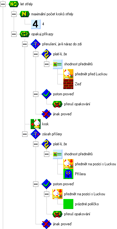 Za posunem střely o krok otestujeme, zda střela zasáhla cíl. Použijeme podmíněný příkaz s testem, zda předmět na pozici s Luckou je předmět Příšera. Pokud ano, vymažeme příšerku položením předmětu prázdné políčko a přerušíme cyklus letu střely.