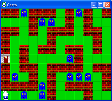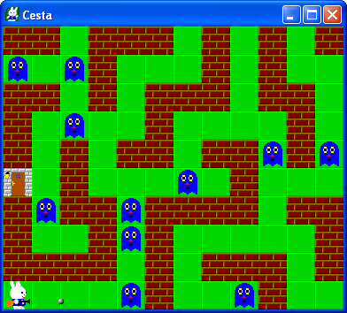 Zkusíme si udělat malou hru. Petřík v bludišti narazil na příšery. Ale nebojte se, až ho ozbrojíme, hravě je zvládne. Budeme pokračovat v našem programu Cesta z předešlé kapitoly, ve kterém jsme zanechali zapnutý poslední způsob ovládání - ovládání držením kláves 2.