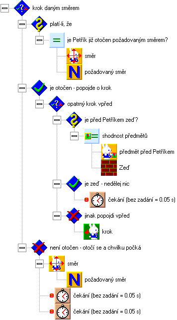 Není-li Petřík správně otočen, otočí se do požadovaného směru a program chvíli čeká. Čekání zajišťuje, aby se Petřík při krátkém ťuknutí do klávesnice nerozešel.