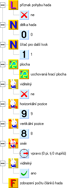 Vytvořte logickou proměnnou příznak pohybu hada, číselnou proměnnou délka hada, číselnou proměnnou čítač pro další krok a funkci s názvem zobrazení počtu článků hada. Logickou proměnnou příznak pohybu hada použijeme k indikaci zahájení pohybu hada (po startu hry bude had stát na místě a čekat na stisk první klávesy). Hodnotu proměnné nastavte ve funkci nová hra na vypnuto (tj. ne). Proměnná délka hada udává počet článků hada a během hry se zvyšuje. Při zahájení nové hry ji nastavte na 0. Čítač pro další krok čítá časové impulsy 0.05 sekundy, než se provede posun hada o políčko (snižuje se od hodnoty 9 do 0, čili jeden krok trvá asi 0.5 sekundy). Nastavte čítač při zahájení hry na hodnotu 1, aby se první krok provedl ihned po stisku první klávesy.